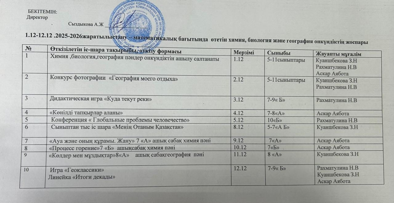 2025 жылдың 1–12 желтоқсан аралығында мектебімізде химия, биология және география пәндеріне арналған жаратылыстану-математика бағытының онкүндігі өтеді. Онкүндік аясында 5–11 сынып оқушыларына арналған танымдық, шығармашылық және ғылыми бағыттағы іс-шаралар жоспарланған.